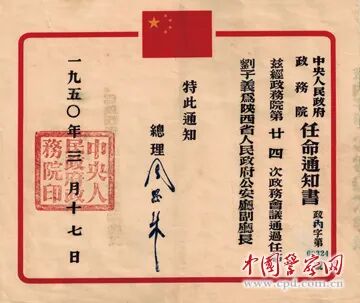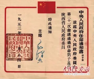 榆林警察史馆自2019年成立以来,已搜集了许多公安珍贵文物,如1936年的《政治侦探须知》油印本、《陕甘宁边区政府任命状》等。日前,在史馆第二部分“金盾摇篮”的第六个展柜中,展出了几件文物:一封写给原司法部部长邹瑜的信,两份原陕西省公安厅厅长刘子义的家属捐赠的毛主席、周总理签发给刘子义的任命通知书。信纸已经泛黄,“任命通知书”上方正中印有鲜红的五星红旗,盖有毛泽东主席、周恩来总理亲手签名的蓝色戳记,虽经多年,至今仍清晰可见,引人走进历史的深处。