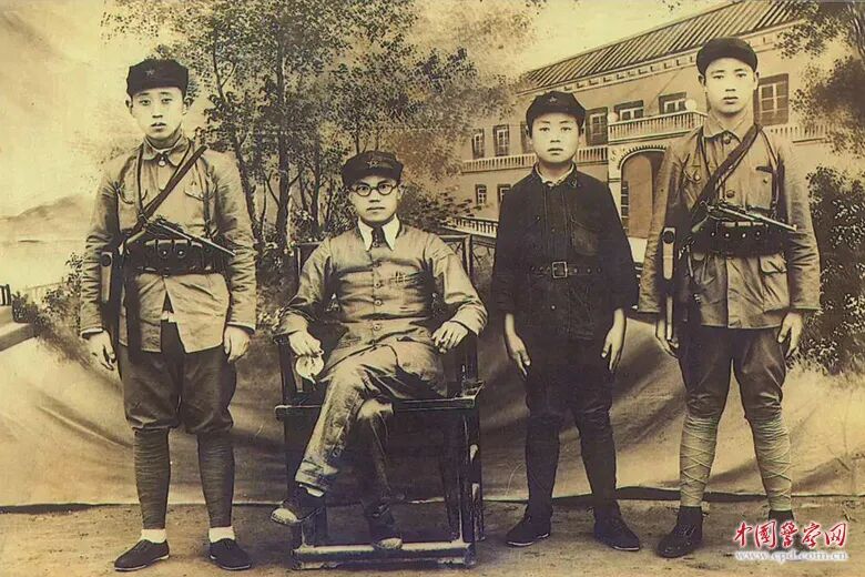 ▲1937年6月,刘子义(左二)与警卫员刘光进(左一)、齐旺胜(左四)、科员李福胜(左三)在延安蟠龙合影。