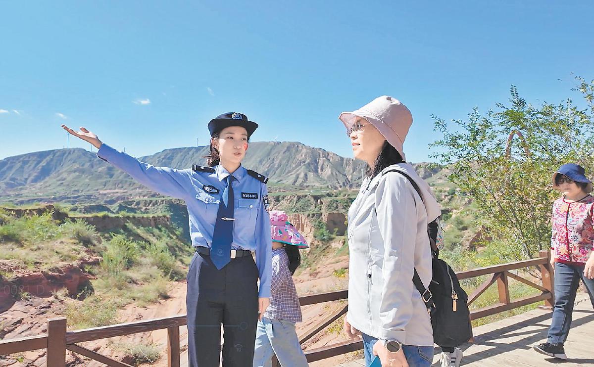 靖边县公安局民警在波浪谷丹霞地貌景区为游客指路。 通讯员 屈玉峰 摄